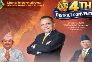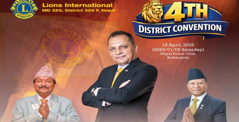 काठमाडौं । लायन्स अन्तर्राष्ट्रिय डिष्ट्रिक्ट ३२५ एफको चौथो कन्भेन्सन वैशाख ५ गते शनिबार काठमाडौंको महिन्द्र क्लब भृकुटीमण्डपमा सम्पन्न हुँदैछ । चौथो कन्भेन्सनसँगै आगामी २०२६र०२७ को नेतृत्व पनि चयन हुनेहुँदा लायन्स अन्तर्राष्ट्रिय डिष्ट्रिक्ट ३२५ एफम...