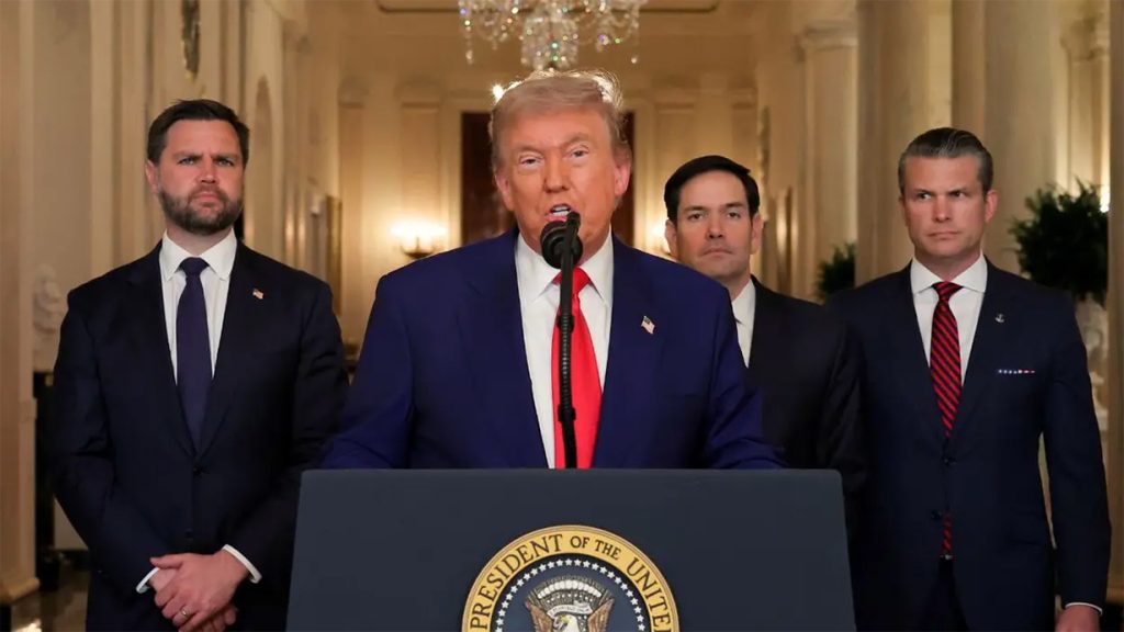 ट्रम्पले ह्वाइट हाउसमा उपराष्ट्रपति जे.डी. भान्स, विदेशमन्त्री मार्को रुबियो र रक्षामन्त्री पीट हेगसेथलाई सँगै राखेर देशबासीलाई सम्बोधन गरेका थिए । उनले इरानलाई मध्यपूर्वको ‘गुण्डा’को संज्ञा समेत दिए ।