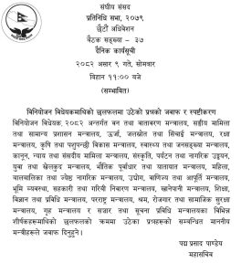 स्वास्थ्य तथा जनसंख्या मन्त्री प्रदीप पौडेल, कानून, न्याय तथा संसदीय मामिला मन्त्री अजयकुमार चौरसिया, संस्कृति, पर्यटन तथा नागरिक उड्डयनमन्त्री बद्रीप्रसाद पाण्डे, युवा तथा खेलकुद मन्त्री तेजुलाल चौधरीले पनि जवाफ दिने सम्भावित कार्यसूची रहेकोछ ।