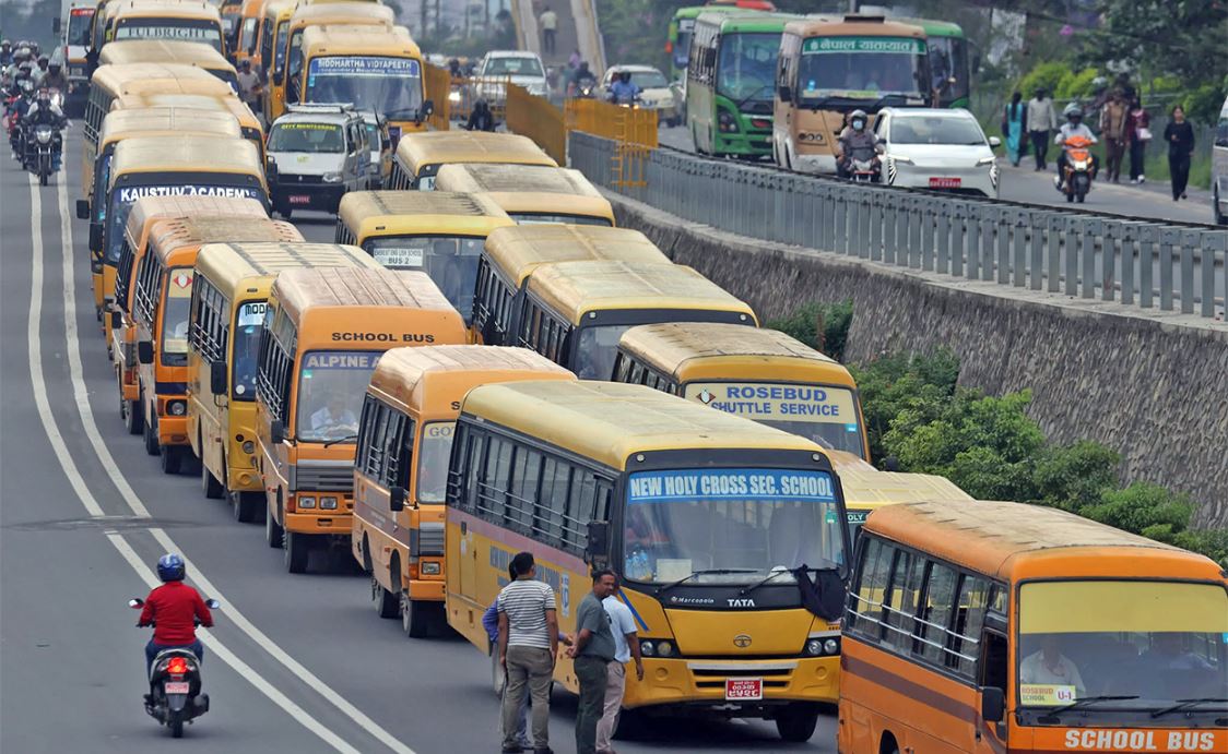 काठमाडौं । निजी विद्यालय सञ्चालकहरूले काठमाडौं चक्रपथमा स्कुल बसको र्याली निकालेका छन् ।