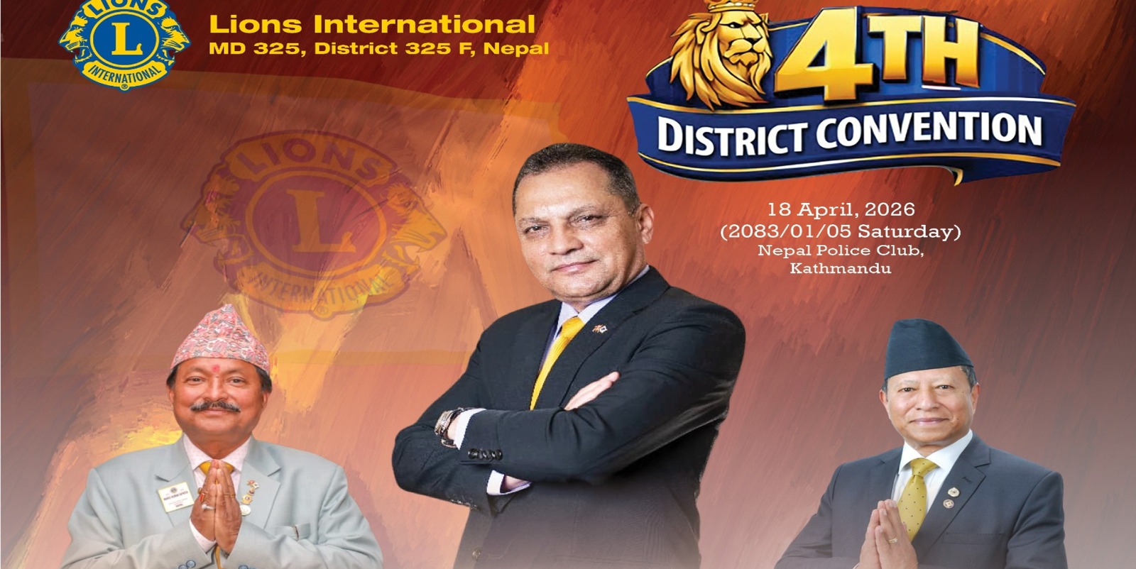 काठमाडौं । लायन्स अन्तर्राष्ट्रिय डिष्ट्रिक्ट ३२५ एफको चौथो कन्भेन्सन वैशाख ५ गते शनिबार काठमाडौंको महिन्द्र क्लब भृकुटीमण्डपमा सम्पन्न हुँदैछ । चौथो कन्भेन्सनसँगै आगामी २०२६र०२७ को नेतृत्व पनि चयन हुनेहुँदा लायन्स अन्तर्राष्ट्रिय डिष्ट्रिक्ट ३२५ एफमा निर्वाचन सरगमी पनि बढ्दैछ । लायन वर्ष २०२६र०२७ का लागि २०२५र०२६ का फष्ट भाइस गभर्नर लायन अजयप्रसाद खनाल गभर्नरमा निर्वाचित हुँदैछन् ।